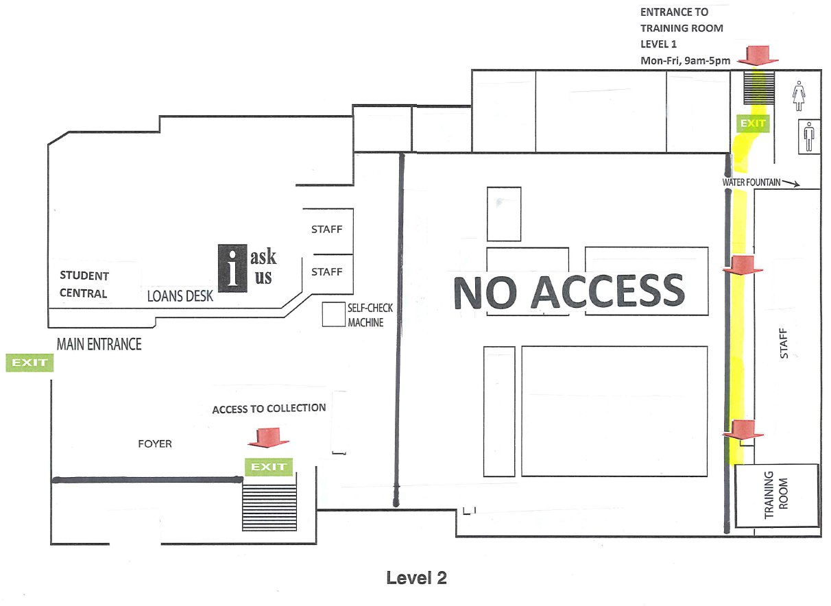 • From Monday 4th April, access to the computer training room from the main library entrance will be blocked. Access to the training room will be via the Emergency Exit door on Level 1 located at the rear of the building closest to the pond. Directional maps will be placed at the loans desk, front entrance door and Emergency Exit door on Level 1. The Training Room will be accessible from 9am to 5pm, Monday to Friday only. Weekends and after hour computer access will be available from the Jack Cross Centre.