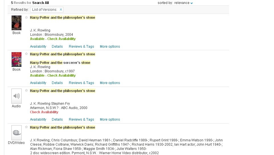 This example shows that the library has two different editions of the book Harry Potter and the Philosopher’s Stone. The library also holds an audio version, as well as the DVD.