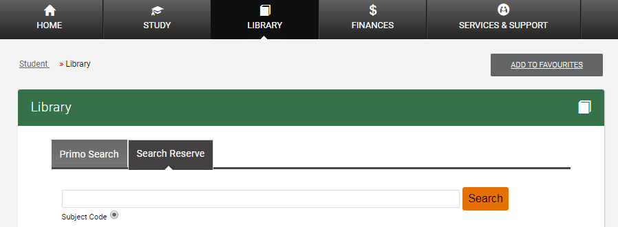 If you’re trying to access your eReserve readings through the Student Portal, Click on the “Library” tab, then click on the “Search Reserve” tab. Type your subject code (with no spaces) into the search bar and hit “Search”.