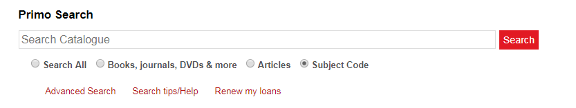 Find your eReserve readings in Primo Search. It’s as simple as clicking on the “Subject Code” radio button, entering your subject code (with no spaces) and clicking “Search”.