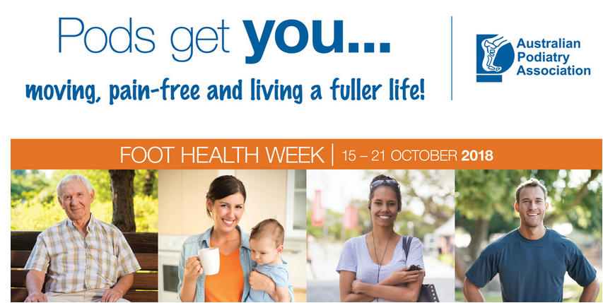 Australian Podiatry Association runs Foot Health Week, it’s an annual campaign to promote foot health and encourages better health outcomes for all Australians. The national theme is ‘Pods get you …moving, pain free and living a fuller life!’.